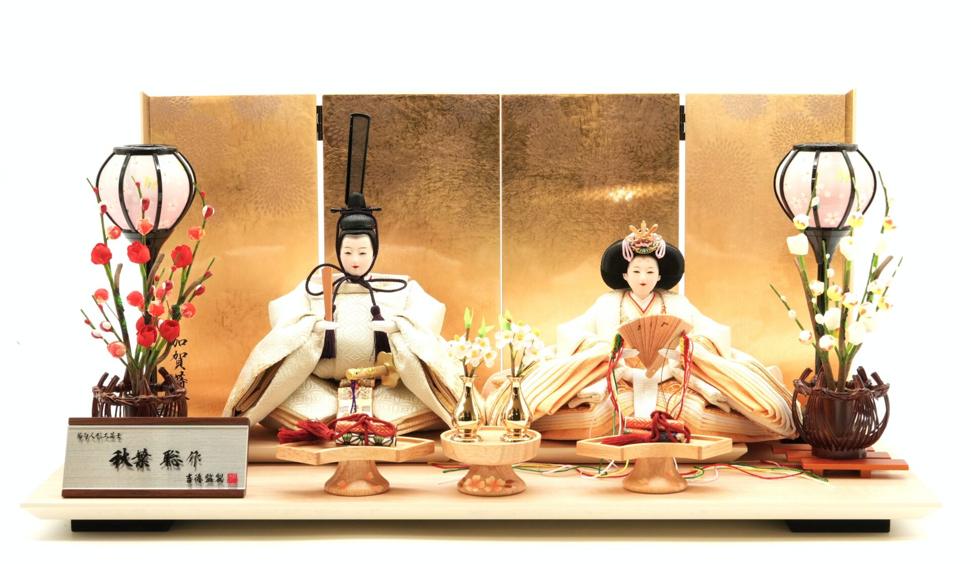 白木の飾り台に、金箔屏風に加賀蒔絵を施した煌びやかで豪華な親王飾り